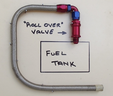 3. I….Here the inspector will check the mounting method, and position (making sure the driver is protected etc.), of the fuel tank, and any water tanks fitted. Fuel cells/tanks must be fitted with a “roll-over” valve, as to stop fuel leaking during an incident. The preferred method is shown here (Diagrammatic only), the valve is fitted to the cell/tank, and with tube or hose run to one side of vehicle, down vertically, then to opposite side of vehicle. This way no matter how the vehicle is sitting, there is minimal chance of leakage from the cell/tank. If you are using a water tank, it is a good idea to keep it out of the driver compartment. Or make sure that there is a relief valve (radiator cap) of a lower value than what is in the cockpit. Vent to the outside away from the driver (hot water can burn, even through a good fire suit).