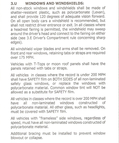 3. U….If your vehicle has windscreen wipers, they must be removed. If your class record is over 175mph window tabs or straps need to be fitted. (Here are some examples).